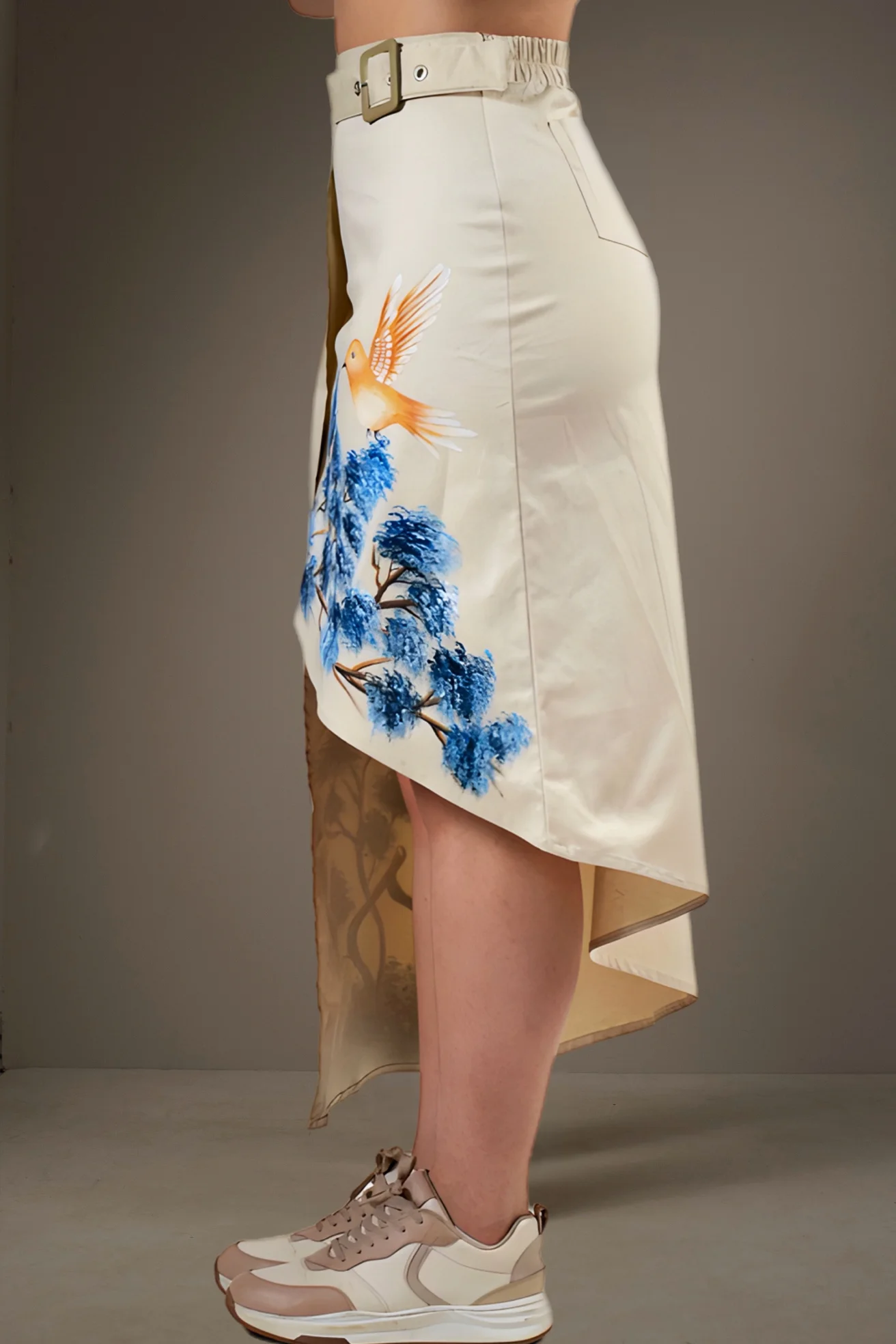 Falda larga irregular con abertura en la parte frontal, un lado largo y el otro lado corto, con cinturón, con cierre, Drill, Pintada a Mano.